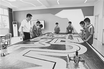 9月10日,在玉山县端明小学机器人拓展课程教室,老师指导学生开展机器人对抗赛演练。“双减”政策实施后,玉山县对义务教育阶段学生课程进行科学调整,增加兴趣课程,让孩子们在快乐中学习。通讯员 吴德强摄
