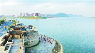 9月14日,在吉水县赣江畔古城墙脚下,市民正在晨练。近年来,该县严守资源环境生态红线,全面推行河湖长制,投资约20亿元,以水生态治理为基础,以庐陵文化为底蕴,重点推进流域防洪排涝、污水处理、堤岸整治、生态岛屿修复,建设水岸景观及旅游设施,全力打造赣江最美岸线。谢 强摄