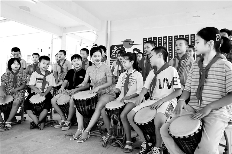 9月22日,在峡江县巴邱镇城北小学,学生们在老师的指导下练习非洲鼓。峡江县在中小学校大力开展“一校一品创特色”活动,利用大课间、课外活动、课后延时增加兴趣课程,让孩子们在快乐中学习。