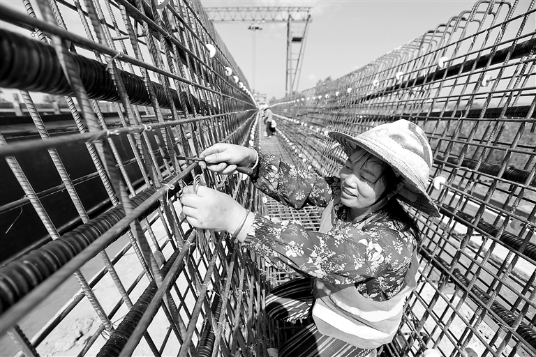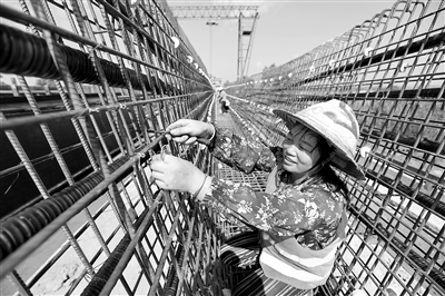 10月6日,在峡江县赣江大桥扩建工程现场,工人在紧张施工。国庆期间,峡江县许多劳动者坚守岗位,在忙碌中度过假期。