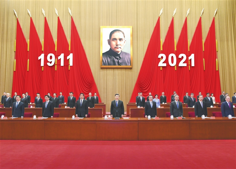 人民大会堂大礼堂气氛庄重热烈。主席台上方悬挂着“纪念辛亥革命110周年大会”会标,后幕正中是孙中山先生画像,10面红旗分列两侧,上面悬挂的“1911”“2021”字标格外醒目。