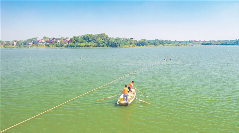 10月5日,九江市柴桑区城子镇白马湖村党员志愿者在辖区赤湖内巡湖、清理漂浮物。近年来,柴桑区扎实推动河长制工作贯彻落实,持续改善河湖生态,全力守护美丽河湖。通讯员 杨风胜摄