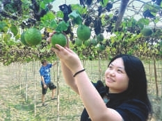 10月7日,奉新县东垦场越山分场吊瓜基地,游客正在采摘成熟的果实。据了解,农民仅种植吊瓜每亩年增收5000元,同时带动40多人家门口就业。通讯员 温芳雯摄