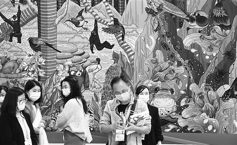 这是10月12日在《生物多样性公约》第十五次缔约方大会新闻中心拍摄的大幅彩绘作品。