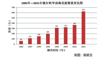 1981年以来,省内外专家先后对桃红岭梅花鹿国家级自然保护区(以下简称“桃红岭保护区”)的华南梅花鹿种群数量开展过8次调查。掌握的估计数量为:1983年60头、1990年150头、2006年321头、2011年365头等。今年初,据该保护区和江西师范大学生命科学学院联合调查显示,华南梅花鹿种群数量估计为624头,较2011年增加259头,较保护区成立初期增长10倍。