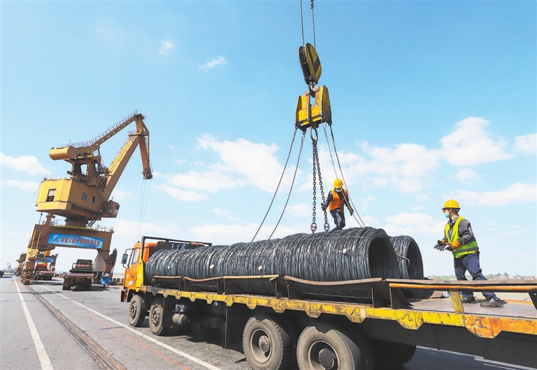10月12日,湖口县方大九钢公司码头工人正在进行成品钢材装船作业。今年以来,该公司抢抓机遇,挖潜增效,钢铁产销两旺,1月至9月销售收入248亿元,上缴税金8.05亿元。
