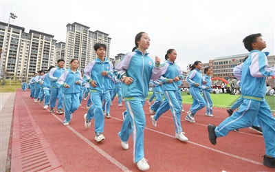 10月15日,在于都县胜利学校操场,学生伴着轻快活泼的音乐,在校园里进行跑操。据悉,该县积极落实“双减”政策,创新教学方法和组织形式,让学生充分享受运动快乐,锻炼身体、健康成长。