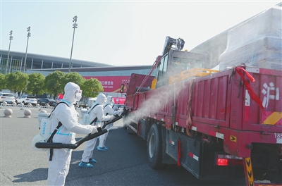 10月23日,工作人员对抵达的展品进行入馆前消杀工作。