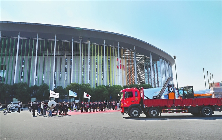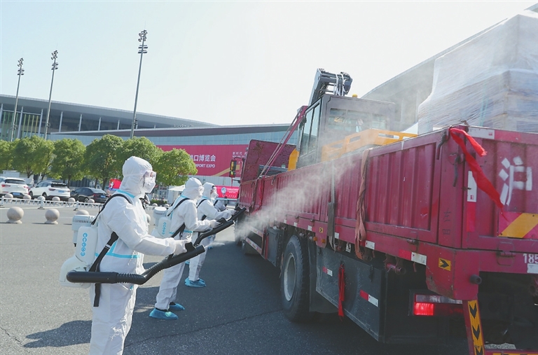 10月23日,装载展品的卡车抵达国家会展中心(上海)北广场。