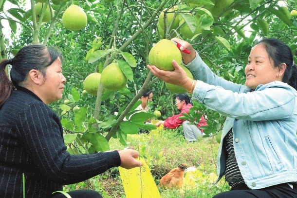 10月18日,永新县禾川镇樟石村千亩蜜柚迎来了大丰收,果农正忙着采摘。近年来,该村调结构、兴产业,大力发展蜜柚产业,昔日的绿苗苗如今变成了金果果,切实鼓起了村民的钱袋子。 通讯员 刘平华摄