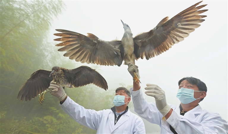 “以前捕鸟为了温饱,现在捕鸟是为了环保。”10月26日,在万鸟齐飞的营盘圩乡万鸟岭脚下,全国鸟类环志中心南风面保护区营盘圩鸟类环志站内,曾昭明父子与环志站工作人员一起,为前一天捕获的鸟佩戴鸟环、测量个体数据信息,再把鸟放归大自然。2002年以来,该环志站已对仙八色鸫、池鹭、夜鹭、白鹭等210种、3.8万余只鸟进行环志。