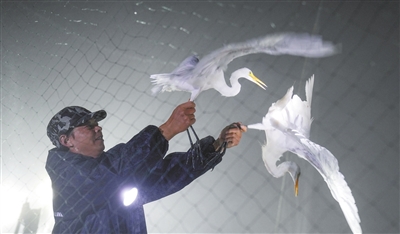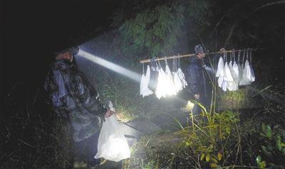 10月25日雨夜19时左右,营盘圩乡桐古村村民曾宪财,与父亲曾昭明及十几名科研人员、志愿者一起忙着科研捕鸟,为鸟类科研环志做准备工作。鸟类环志是世界上用来研究候鸟迁徙动态及其规律的一种重要手段。