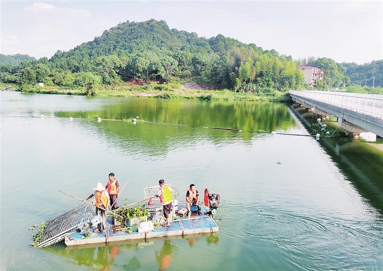 为全面推进河长制工作,呵护好一江碧水。石城县大由乡坚守生态底色,组织乡村干部、保洁员加班加点在河道内开展水葫芦清理工作。工作人员登上水葫芦清理船,采用机械与人工共同协作的方式清理水葫芦。对打捞上来的水葫芦,工作人员选择合适的地点妥善处理,避免再次流入河道及水域,发生二次污染。通过常态化开展河道清理行动并形成长效机制,有效遏制了水葫芦的生长蔓延,保障了河道畅通,改善了河流生态环境,全力打造河畅、水清、岸绿、景美的水生态环境。(陈智强)