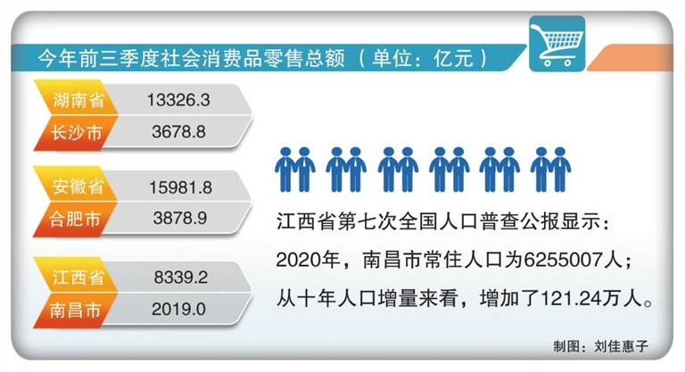 窥一斑而知全豹。今年前三季度,湖南省社会消费品零售总额超1.3万亿元、安徽省超1.5万亿元、江西省8339.2亿元。从省会城市消费水平看,长沙3678.8亿元、合肥3878.9亿元、南昌2019.0亿元。从增速看,南昌在上述省会城市中居于首位,而从在省内所占份额看,南昌尚有差距。