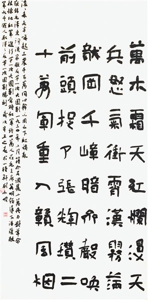 | 隶书 《毛泽东·渔家傲·反第一次大“围剿”》 释文:万木霜天红烂漫,天兵怒气冲霄汉。雾满龙冈千嶂暗,齐声唤,前头捉了张辉瓒。二十万军重入赣,风烟滚滚来天半。唤起工农千百万,同心干,不周山下红旗乱。刘小明书 |