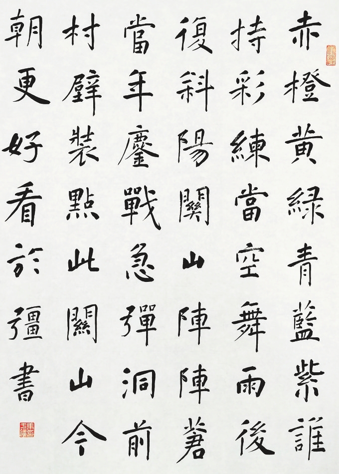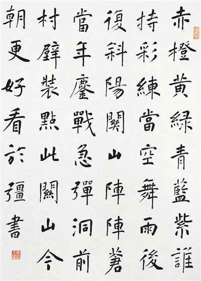 | 楷书 《毛泽东·菩萨蛮·大柏地》 释文:赤橙黄绿青蓝紫,谁持彩练当空舞?雨后复斜阳,关山阵阵苍。当年鏖战急,弹洞前村壁。装点此关山,今朝更好看。马于强书 |