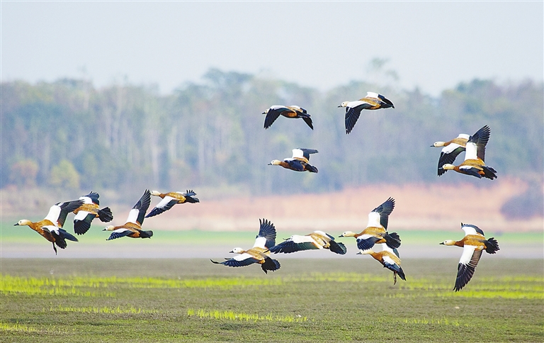 11月12日,在鄱阳湖都昌湿地越冬的冬候鸟展翅飞翔。初冬时节,数十万只候鸟飞抵鄱阳湖湿地越冬,丰富的湿地资源和良好的生态环境,使这里成为越冬候鸟的乐园。 特约通讯员 傅建斌摄