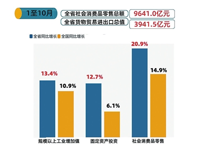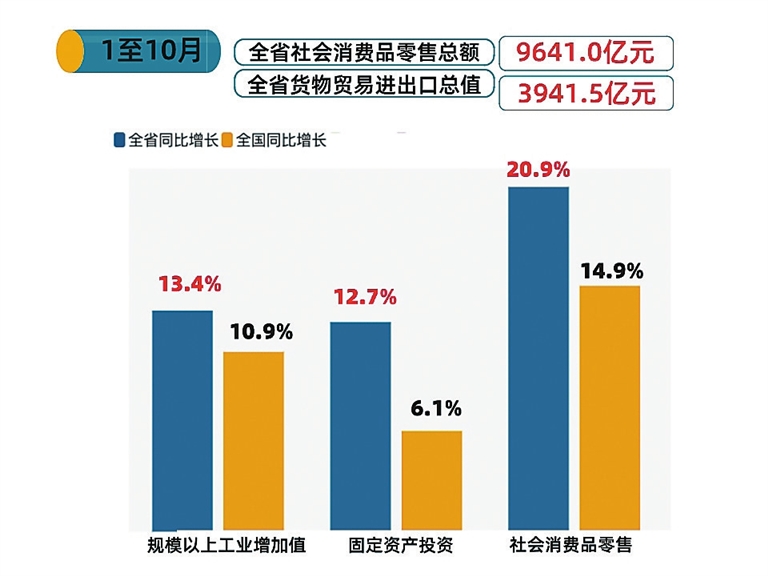 本报讯 (殷琪惠 记者郑荣林)近日,省统计局发布的最新经济运行数据显示,今年1至10月,我省经济运行总体平稳,继续保持平稳恢复态势,主要经济指标增速处于全国前列,经济发展韧性和活力持续显现。