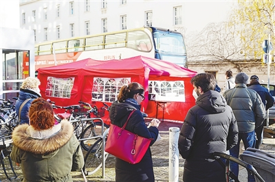 11月22日,人们在德国首都柏林一辆“疫苗巴士”前排队等待接种新冠疫苗。为方便人们接种新冠疫苗,德国柏林在市内多地分批部署“疫苗巴士”,每辆巴士每小时最多可为20人进行接种。