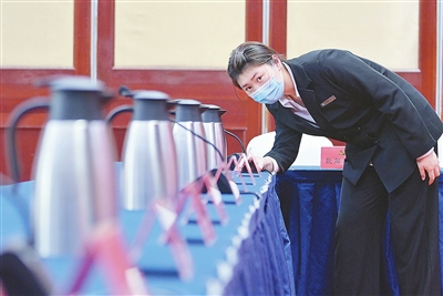 11月24日,南昌前湖迎宾馆省党代会各代表团讨论会场,来自江西旅游商贸职业学院的大学生志愿者董凯欣正在精心布置会场。为保障省党代会顺利召开,有关部门强化安全及疫情防控措施,不断提升会务服务水平,全力做好各项服务保障工作。