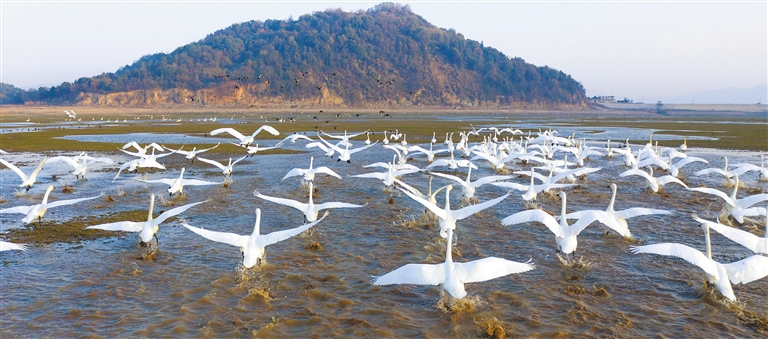 近日,成群小天鹅在鄱阳湖都昌湿地栖息、觅食,宛如一首优美的冬舞曲。