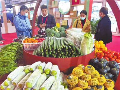 农博会首日,参展企业将果蔬、粮油、肉蛋、水产等农产品摆放在各自展区醒目位置,不少民众推着组委会提供的小推车正在挑选购买。