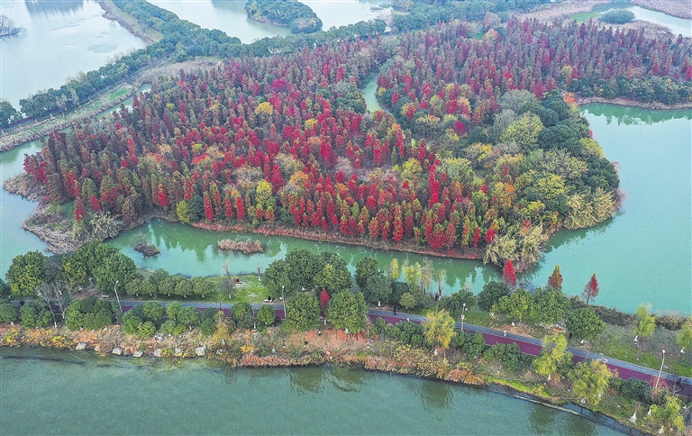 12月11日,南昌市艾溪湖森林湿地公园色彩斑斓,冬景如画,吸引游人前来观赏。