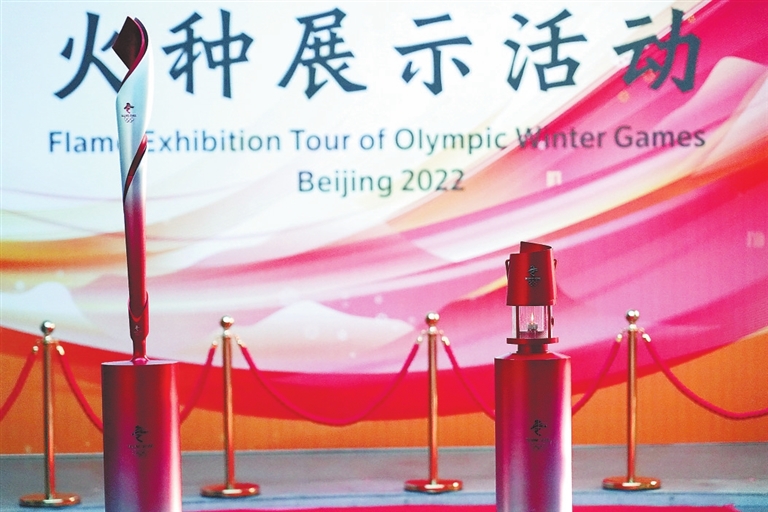 这是12月13日在展示活动中拍摄的北京冬奥会火种灯和北京冬奥会火炬。