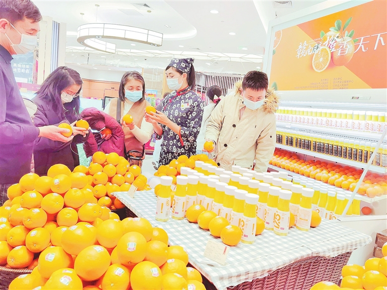芳香四溢的鲜橙、香甜可口的橙汁、精致小巧的脐橙酥……12月12日,赣南脐橙北京文化周活动启动后,笔者走进王府井百货大楼,在赣南脐橙展销处,看到一堆堆造型别致的鲜橙和各种包装精致的脐橙深加工产品,吸引不少市民、游客驻足品尝、购买。