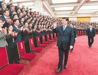下午3时30分,习近平等来到人民大会堂北大厅,全场响起热烈掌声。习近平等向代表们挥手致意,同大家亲切交流并合影留念。