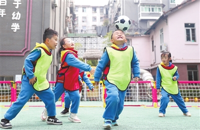 12月8日,南昌市滕王阁保育院开展第二届校园足球节活动,孩子们通过带球跑、脚法大比拼等趣味足球游戏,感受足球带来的快乐。 张翰林摄