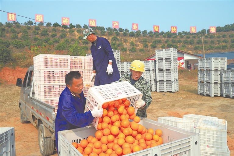 12月12日,芦溪县源南乡石塘村3000亩脐橙种植产业帮扶基地一片繁忙。该脐橙园安排就业岗位100余个,帮助在基地务工的村民人均增收5000元。通讯员 龙 婷摄