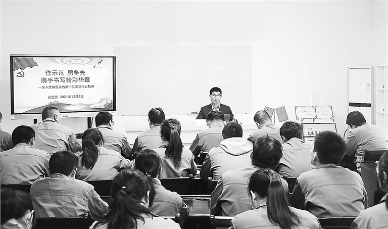 图① 省党代表袁志勇在中材电瓷宣讲省第十五次党代会精神。