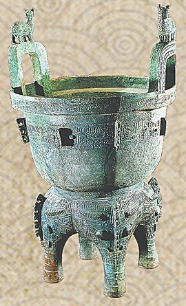这件四足铜甗,重达78.5千克,体形巨大,气势雄浑,为迄今所见青铜甗中最大者,有“甗王”之誉。铸造工艺方面,除了耳上双鹿,整个器物一次浑铸成型。四足铜甗在商代较为少见。甗上出现了殷墟时期流行的斜角雷纹、上卷尾连体兽面纹、牛角兽面纹等纹饰,耳上加铸立鹿的特点则与新干方鼎、扁足鼎加铸动物造型的风格一致。可以推断,这件器物铸造于商代晚期,体现了当地人对中原青铜器的本土改造。现藏于江西省博物馆。 (本报记者 罗翠兰)