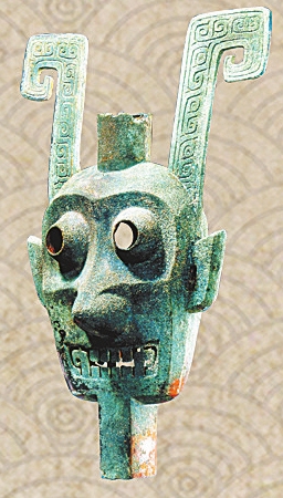 这件器物为一中空的扁平双面人首造型,额部宽,颌部窄,呈倒置的等腰梯形。两面均有中空的圆凸目,竖耳上部尖,肥鼻,高颧骨,张口露齿,两侧嘴角上翘,下犬齿外卷形似獠牙。头两侧各出一角。整个形象显得神秘恐怖。