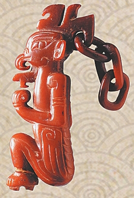 侧身羽人玉佩饰高8.7厘米,背脊厚1.4厘米,三环通长4.6厘米,呈枣红色,采用圆雕成型,浮雕与镂雕工艺相结合,羽人造型,顶冠高耸,嘴巴喙状,腰背羽翼,屈臂蹲坐。该玉器令人惊叹之处在于凭借专用的掏雕工具,将羽人后面多余的玉料掏出了形状大小几乎相同、又灵活自如、没有丝毫缝隙的三个环状相扣的活链。活链不仅利于佩挂,而且小料巧作大器。这是一件用于佩挂的青田玉饰,它包含“羽化登仙”“沟通神灵”的思想,代表了古人的生死观。现藏于江西省博物馆。 (本报记者 罗翠兰)