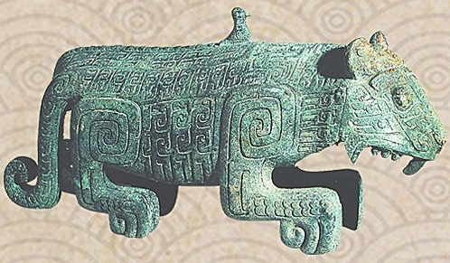 新干大洋洲商墓出土的不少器物上都有虎的装饰,且风格基本一致,多为突出位置的高浮雕虎纹或圆雕老虎,构成新干青铜文化的主要特色。一些学者据此推测,虎可能是墓主人家族的崇拜对象或与其家族历史及传说有一定关系,并将其与商代长江流域的重要方国——虎方联系起来。虎与鸟的结合器虽南北方均有发现 (如安阳殷墟出土的妇好觥也是前为虎、后为鸟),但此虎的双尾造型却前所未见。此物被认为是虎方国的形象标识。现藏于江西省博物馆。 (本报记者 罗翠兰)