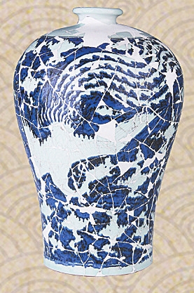 过去常见宝石蓝地饰红、白花纹,而以青花作地为永乐首见。该件文物口径8.5厘米, 高43.6厘米,堪称孤品,是御窑厂遗址出土的众多瓷器中最“碎”的一件,由466块青花瓷片经一年时间拼对、修复而成。其外壁以青花为地,以留白与锥拱相结合,腹部饰青花地刻白龙、白凤纹,展翅凤纹舒展优美,底部刻白海潮纹,整体器型工艺精巧、制作难度大,有极高的文物价值。现藏于景德镇御窑博物馆。 (本报记者 毛江凡)