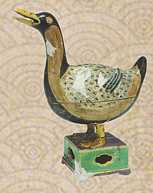 素三彩鸭形香熏通高25.3厘米,熏分上下两截,腹内中空,以子口相合。鸭头、腹、尾部饰墨绿色低温铅釉,喙、足饰黄色铅釉,头、腹侧部涂土黄釉,翅及背羽锥刻处填孔雀绿釉。鸭足与中空的方形器座相连,器座底部书“大明成化年制”款。该器腹部合缝处子口上分布均匀的六个小孔的设计最为精绝,它巧妙地利用了景德镇高温瓷器子口的不可能完全密闭性特点,通过六个孔与子口的缝隙,与鸭头中空相通,从而起到烟囱作用。