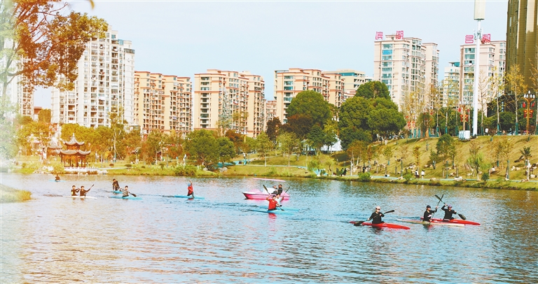 12月19日,周末的浮梁县三贤湖热闹非凡,岸边站满了观看训练的市民。伴随着阵阵加油呐喊声,皮划艇在湖面上快速穿梭。