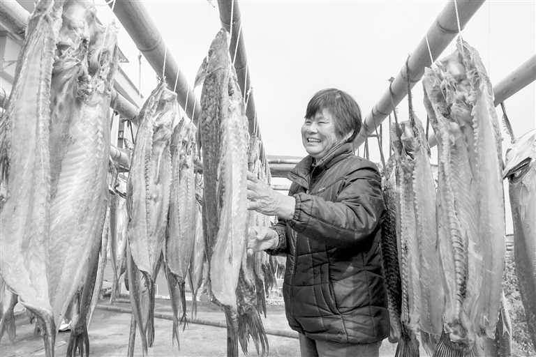 | 2021年12月22日,峡江县巴邱镇东门社区居民正在晾晒鱼干。冬至过后,居民抓住晴天低温天气,利用传统方法制作各式鱼干,供应春节市场。特约通讯员 陈福平摄 |