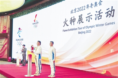 2021年12月29日,护卫人员展示冬奥会火种灯。 当日,2022北京冬奥会火种展示活动在北京市延庆区世园公园中国馆内举行。新华社记者 李 欣摄