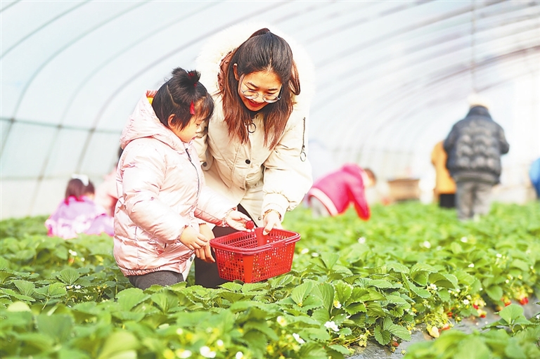 1月2日,游客在上高县锦江镇锦南村草莓种植基地采摘草莓。近年来,该镇大力发展观光休闲农业,助农增收致富。
