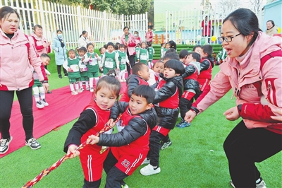 1月5日,德兴市银山幼儿园的小朋友们正在举行幼儿弹力绳拉力赛,多彩课间欢乐多。