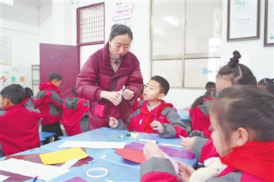 1月7日,在新余市渝水区渝水五小的课堂上,学生们在老师指导下学习剪纸。自“双减”政策实施以来,该市各个学校开设足球、绘画、古筝等兴趣班,组织多样化的教学活动,供学生自由选择,培养学生兴趣特长。
