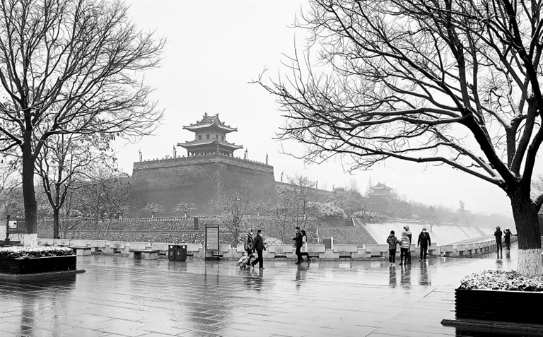 1月23日,市民在古城墙下休闲散步。随着西安市17个区县、开发区有序恢复正常生产生活秩序,原本冷清的大街、公园被阵阵欢声笑语填满,人们走出家门,用热气腾腾的生活迎接虎年的到来。