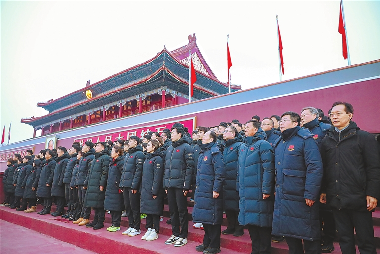 当日,北京冬奥会中国体育代表团部分成员来到天安门广场观看升国旗仪式,并宣誓出征。 新华社发 (国家体育总局冬季运动管理中心供图)