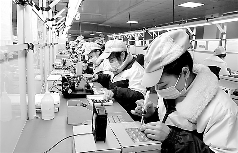 图2 萍乡市湘东区抢抓新一轮光电产业发展机遇,引进、培育和发展了长益光电、盛显光电等一批规模以上光电信息企业,初步形成电子信息产业集聚,所生产的LCD显示屏、光学镜头、LED光电产品等电子设施配套产品销往国内及日本、韩国和欧洲。图为湘东区哲毅丽光电科技有限公司生产车间,工人们正在赶制订单产品。李桂东摄