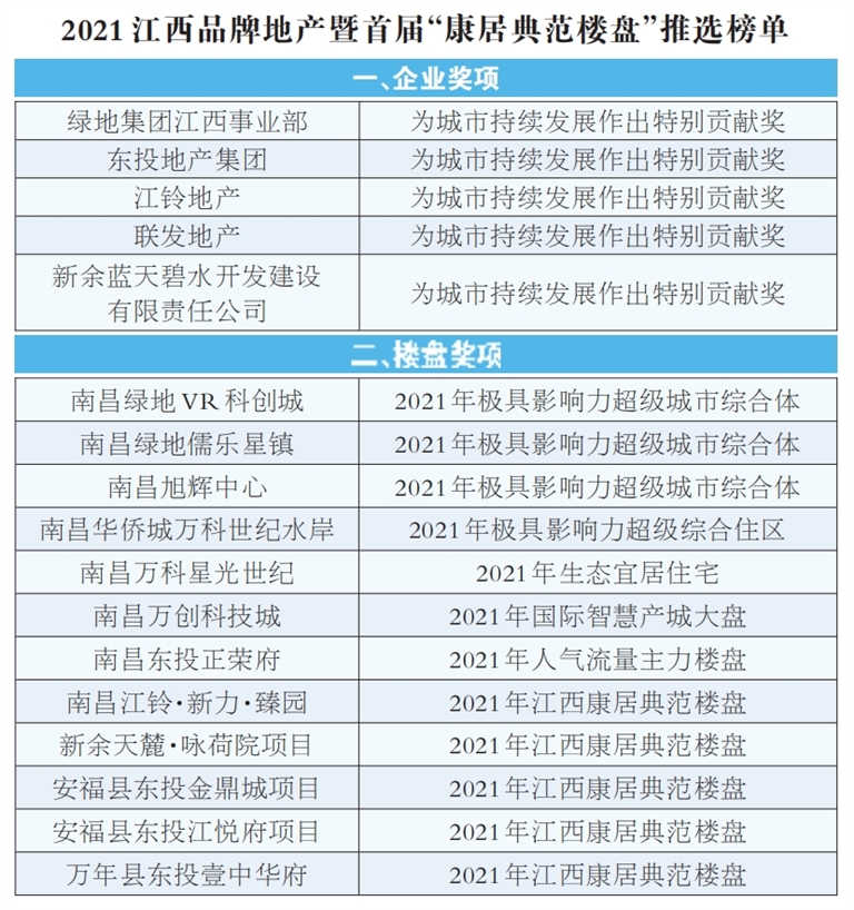 为了庆祝全面建成小康社会,凝聚全面建设社会主义现代化国家的奋进力量,展现我省人居环境迈入康居新水平,展示房企为宜居宜业城市及康居环境作出的持续贡献,本报于近期成功策划推出“2021江西品牌地产暨首届‘康居典范楼盘’推选活动”,顺利推选出5家房企、12个楼盘项目获得相关荣誉奖项(具体名单见附表)。