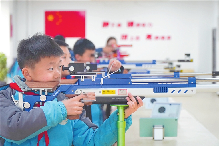 近日,在南昌市东湖区阳明学校射击馆里,孩子们在体验射击运动。该校把原有功能教室改造成射击馆,开设激光枪、手枪、步枪等射击体育兴趣课,由专业射击运动员指导教学,让孩子们在参与中体验乐趣。蔡铖歌摄